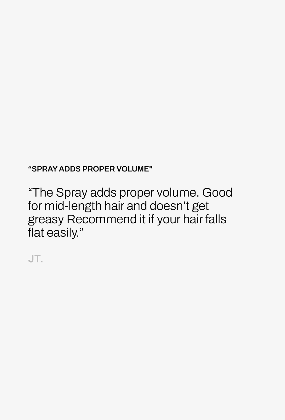 The Spray adds proper volume. Good for mid-length hair and doesn’t get greasy. Recommend it if your hair falls flat easily.